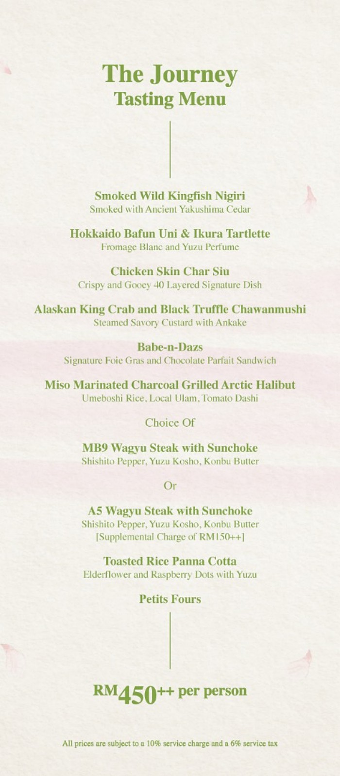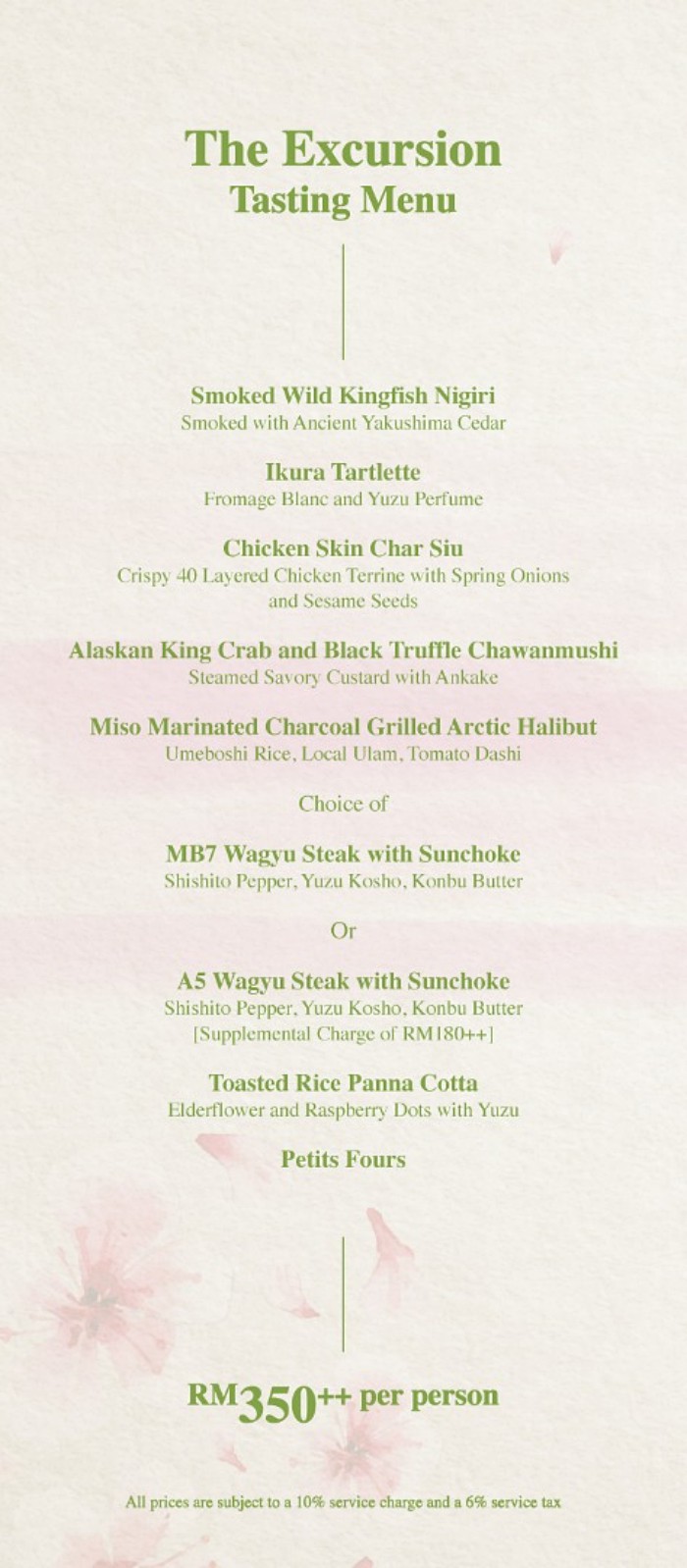 A deposit of RM100 per person is required upon reservation for group reservations of 9 persons and above. Deposit amount will be deducted from the total bill. Payment will only be refunded if cancellation were made more than 24 hours prior to your reservation. Payment will be forfeited if cancellation were made within 24 hours prior to your reservation. Kindly to be informed that, refund amount will be deducted 5% processing fees.